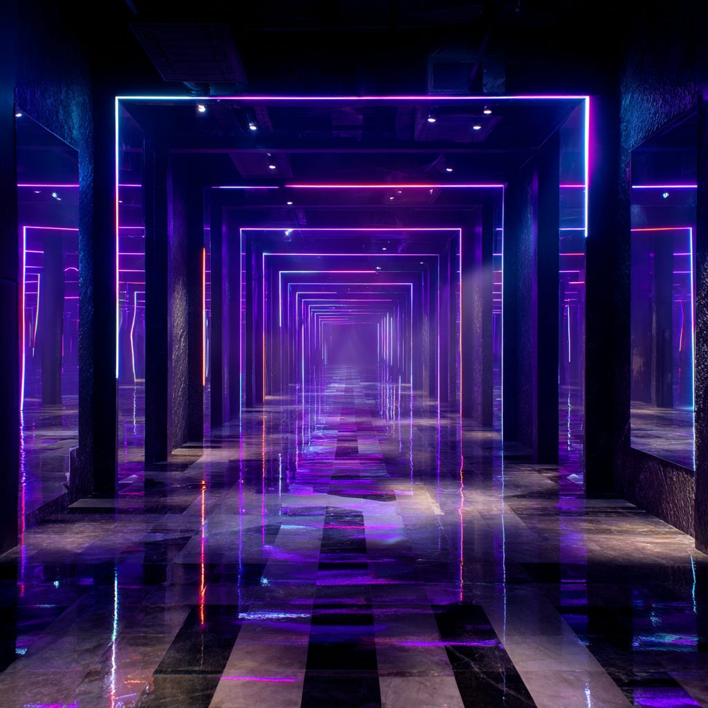 Alan was taking Echo out for some fun. They’d spent time in public before, eating together and competing athletically her first time around at The Foundry, and back when she’d still go to ‘that one place’. Now though, he was leading her into the neon lit entrance hallway of Darkside, each line of light passed beneath was like the rib of some great stomach they’d been entering — purples and blues, pink highlights, a bit of black and white sparkling throughout.